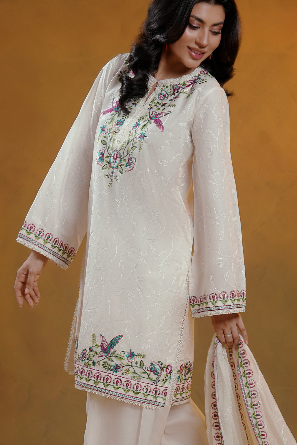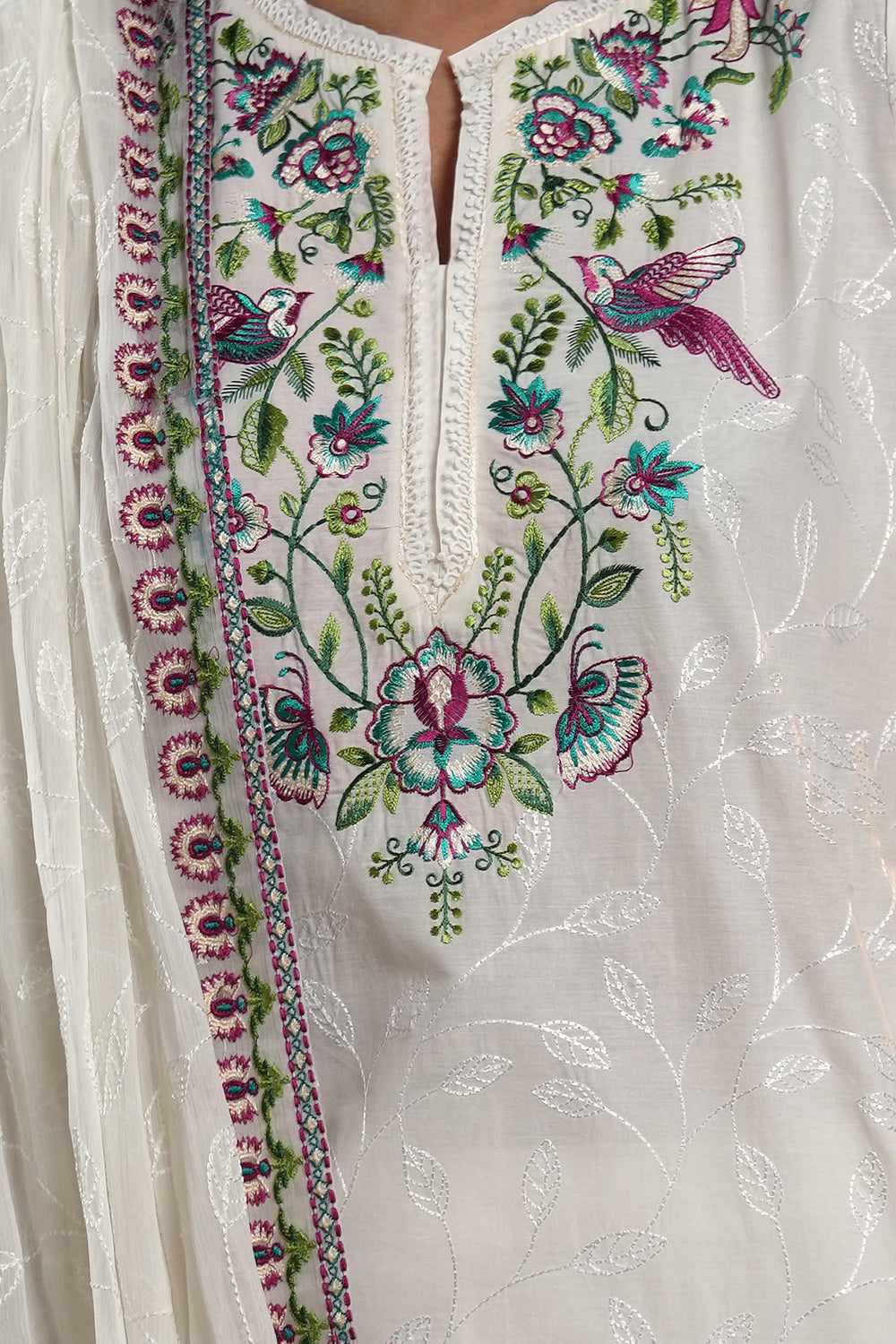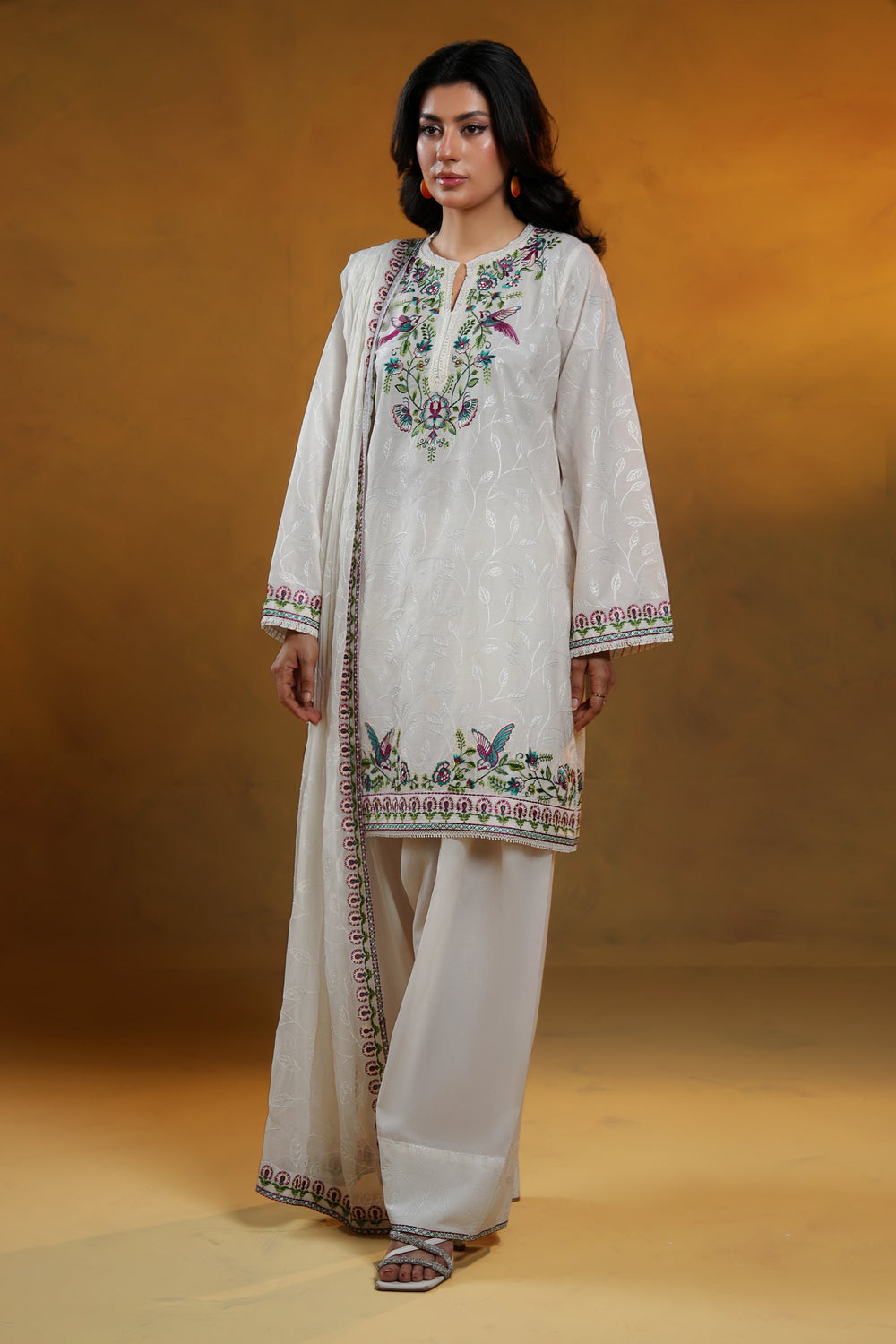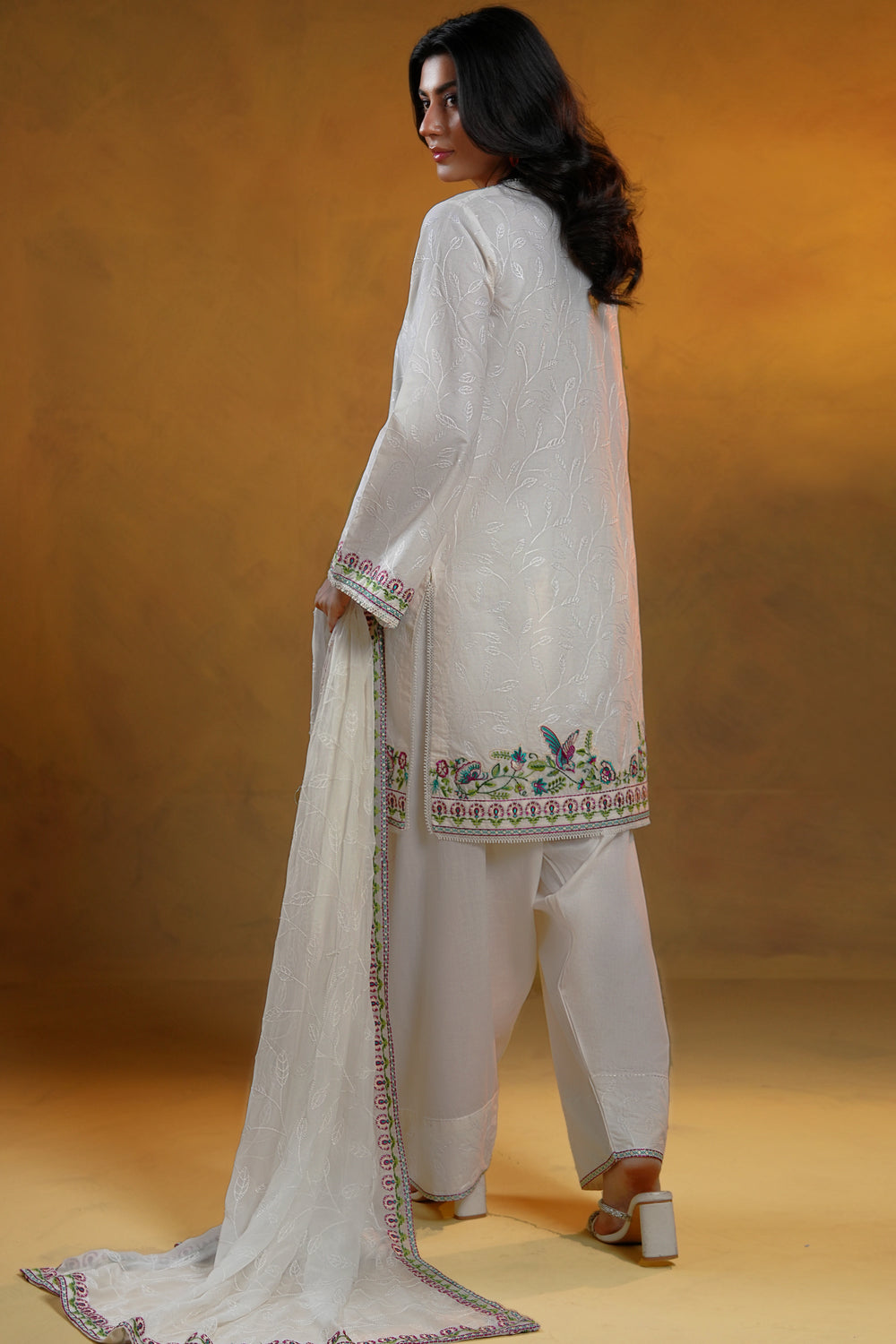 This exquisite white three-piece dress is fully embroidered with intricate, bird designs that add a rich texture and depth to the pristine fabric. The delicate embroidery enhances the simple beauty of the white dress, giving it a timeless and sophisticated look. The outfit is completed with a soft, sheer chiffon dupatta, which adds an airy, graceful touch to the ensemble. Perfect for day events, this dress combines classic elegance with refined details, making it a stunning choice for any special occasion.