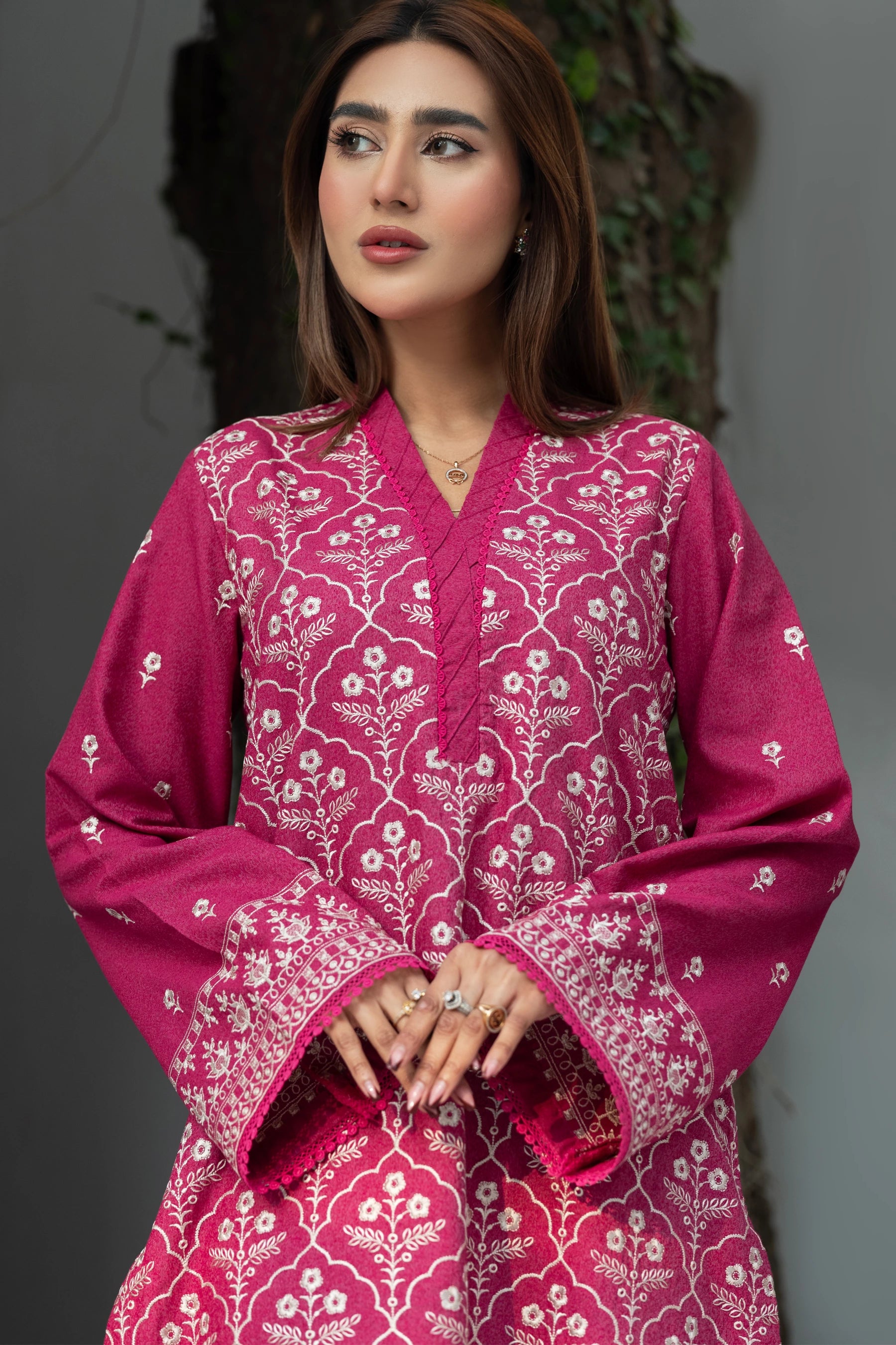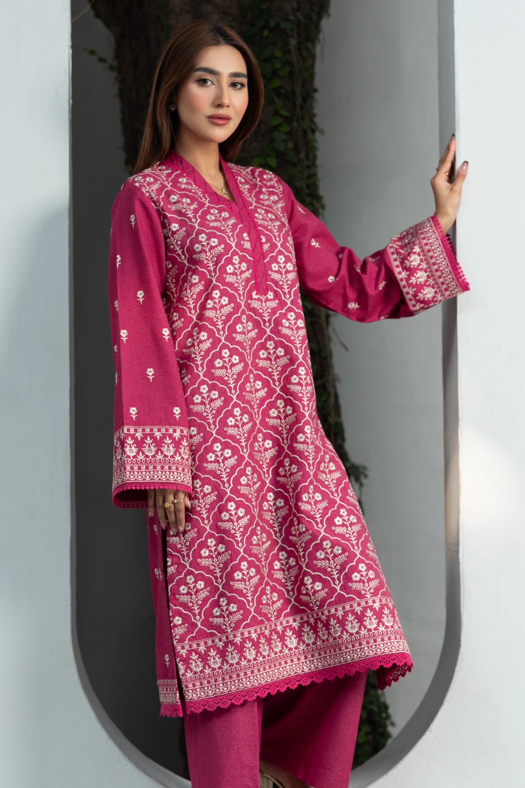 This is a Deep Pink Karandi fabric dress that provides a canvas for golden pearl embroidery to shine through in the form of delicate artwork.