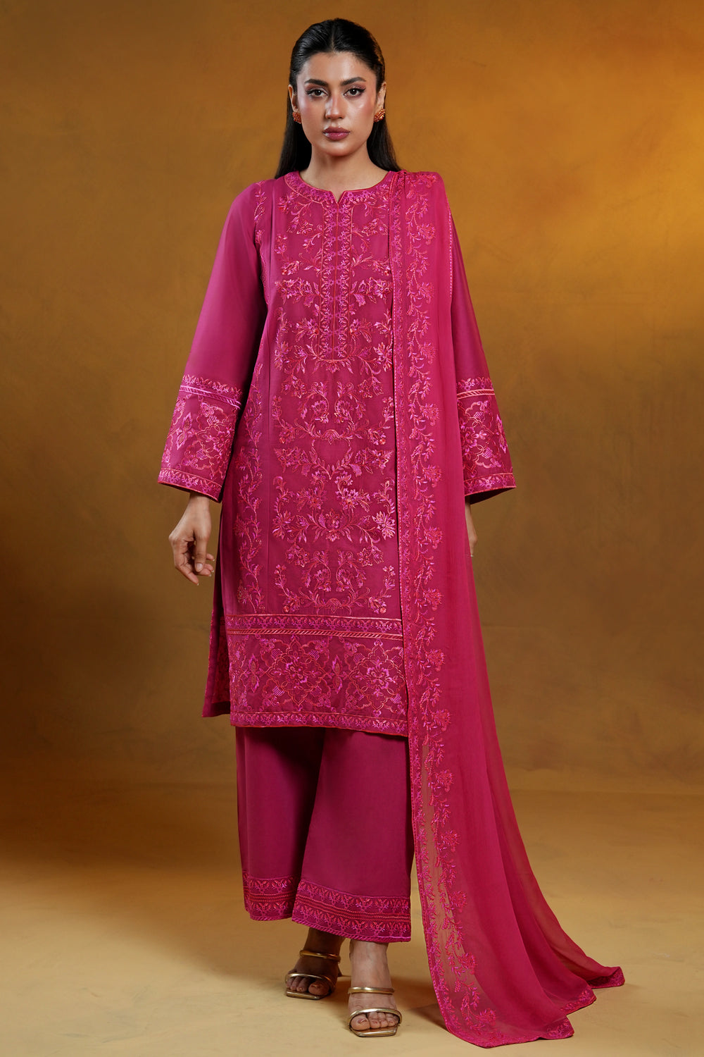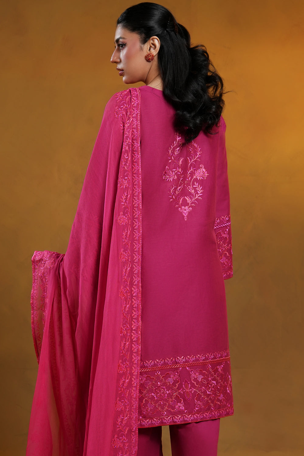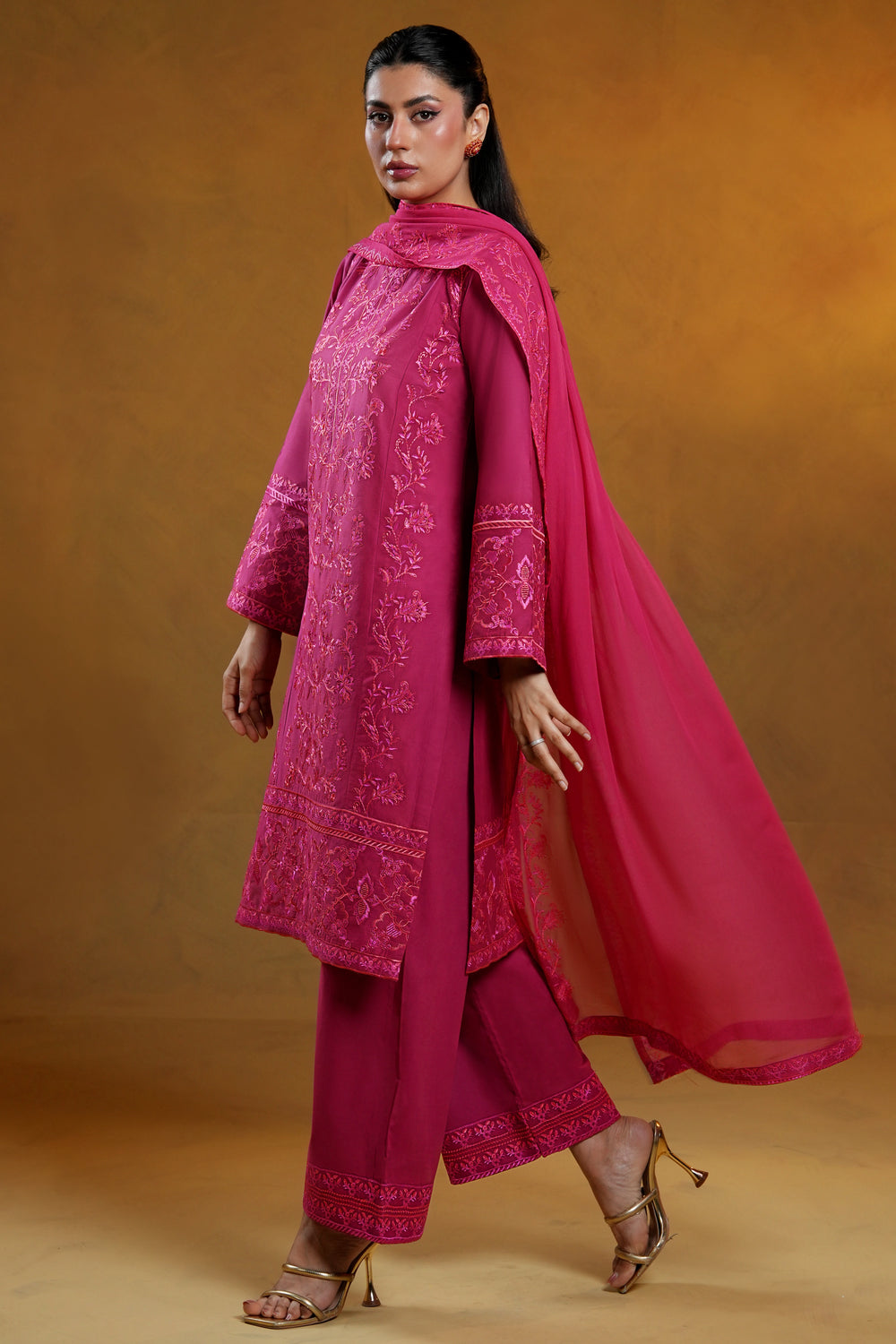 A vibrant fuchsia lawn shirt adorned with intricate floral embroidery across the front, sleeves, and hemline, designed in a flattering straight silhouette.