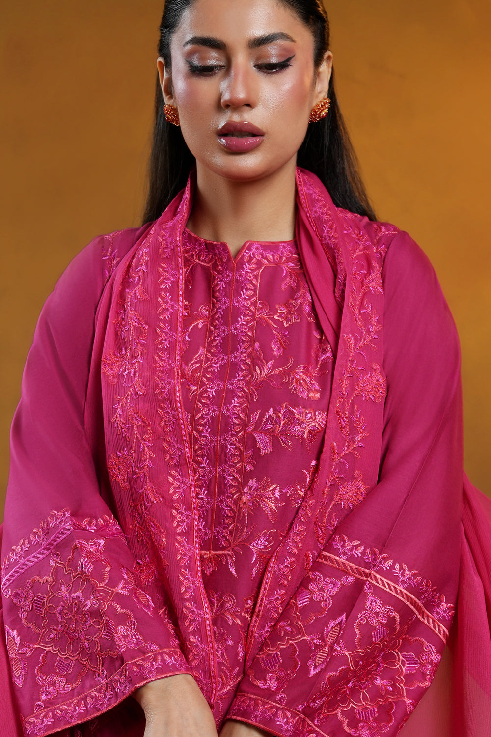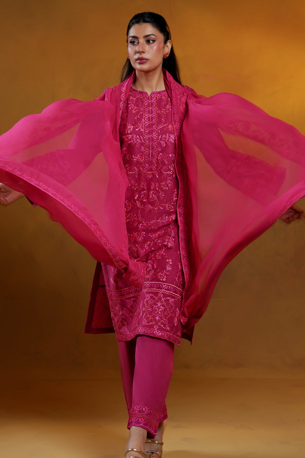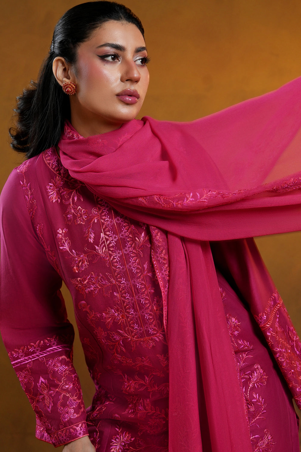 A vibrant fuchsia lawn shirt adorned with intricate floral embroidery across the front, sleeves, and hemline, designed in a flattering straight silhouette.